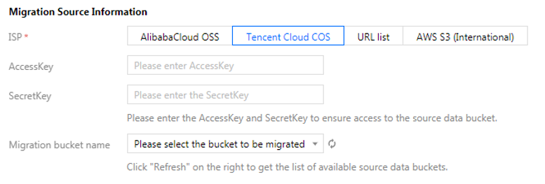 此处迁移源服务提供商应选择腾讯云 COS,并在下方 AccessKey,SecretKey 文本框中输入先前新建用于迁移的腾讯云子用户 SecretId,SecretKey。填入密钥后,单击下拉框右侧刷新按钮,即可获取源对象存储桶列表。