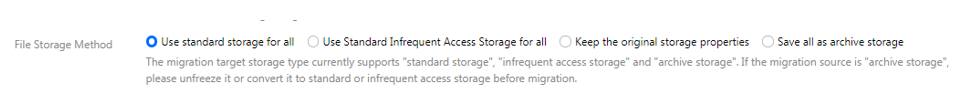 根据迁移的需求,设定迁移后文件的存储方式,可以选择:标准存储、低频存储、保持原存储属性、归档存储。