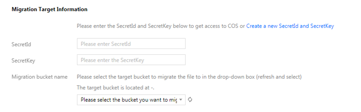 在迁移目标信息中,输入用于迁移的腾讯云子用户 SecretId,SecretKey。填入密钥后,单击下拉框右侧刷新按钮,即可获取目标对象存储桶列表。