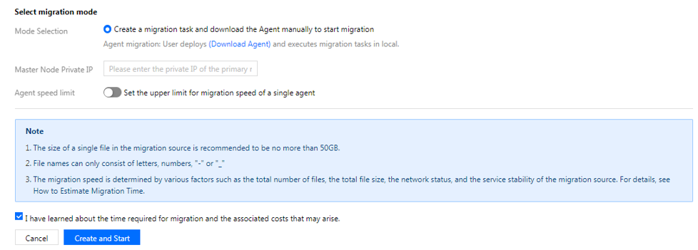 新建迁移任务后手动下载 Agent 启动迁移:选择 Agent 模式迁移,用户在单击“新建并启动”后,将仅创建任务配置,需要用户手动下载 Agent 在迁移源一侧的服务器上部署之后才会正式启动迁移。Agent 模式适用于已有专线希望通过专线迁移的场景。