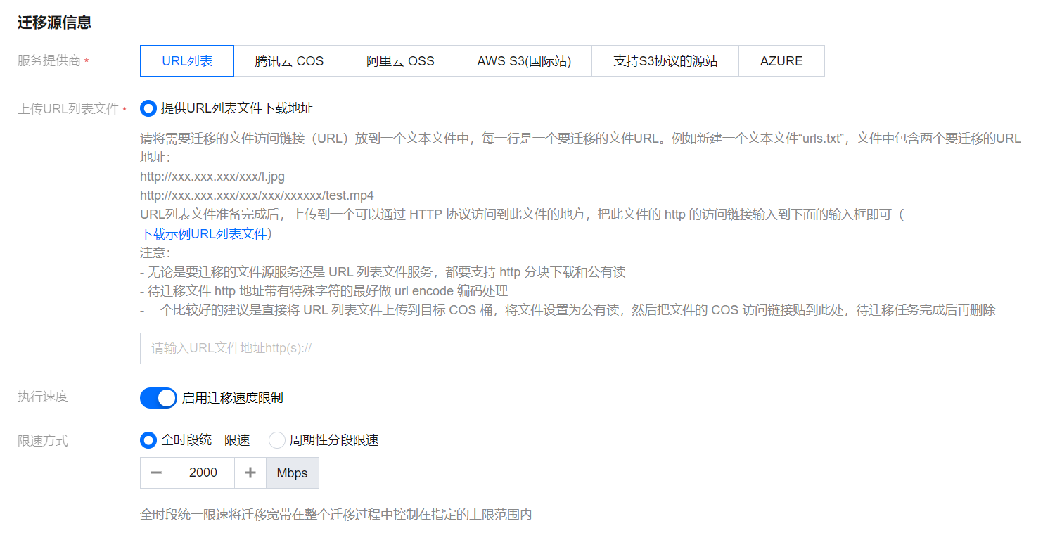 执行速度、限速方式:各公有云厂商的对象存储都有速度限制。为确保业务稳定,请在迁移前与源厂商确认并设置最高迁移可用 Mbps。