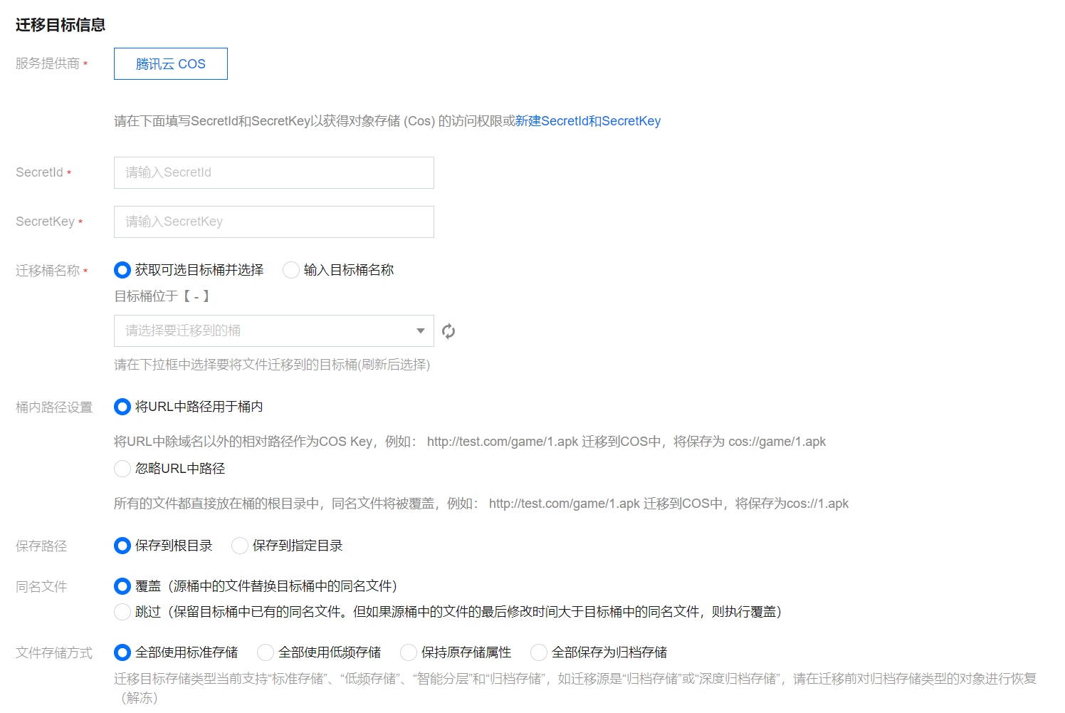 SecretId、SecretKey:输入用于迁移的腾讯云子用户 SecretId、SecretKey。