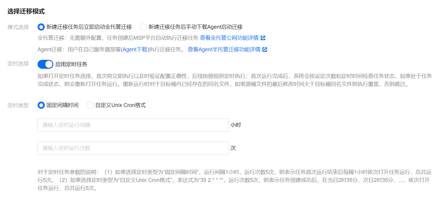 新建迁移任务后手动下载 Agent 启动迁移:选择 Agent 模式迁移,用户在单击“新建并启动”后,将仅创建任务配置,需要用户手动下载 Agent 在迁移源一侧的服务器上部署之后才会正式启动迁移。迁移 Agent 部署参考文档:半托管迁移 Agent 的使用说明。 定时选择:定时任务可以重复运行任务,可以对源桶中的增量文件做出同步。除了第一次任务是立即执行,之后会根据定时设置在固定间隔时间之后或者 Cron 设定的定时规则时触发再次运行。再次运行时“同名文件”会变为“跳过(保留目标桶中已有的同名文件)”,即只同步增量文件。