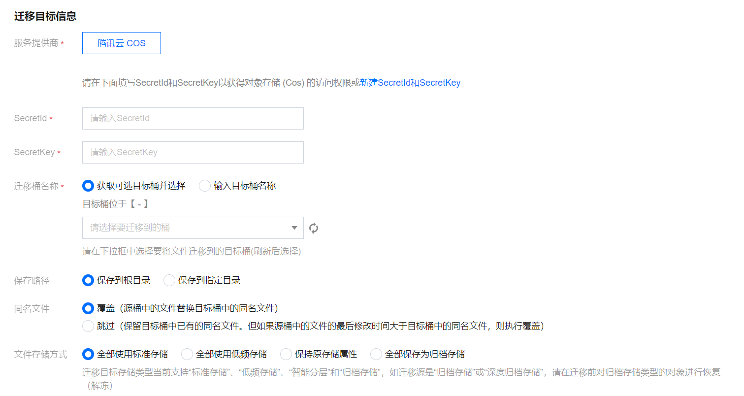 SecretId、SecretKey:输入用于迁移的腾讯云子用户 SecretId、SecretKey。