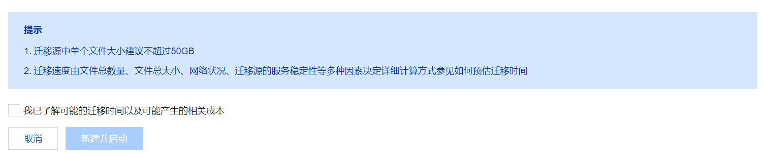 新建迁移任务后立即启动全托管迁移:选择托管迁移,用户单击“新建并启动”后云迁移服务将通过公网访问源存储进行迁移。
