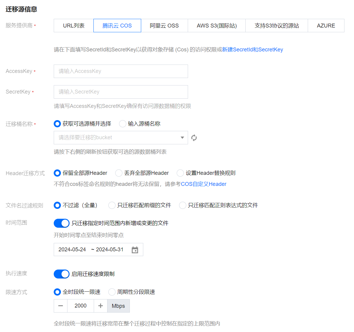 执行速度、限速方式:各公有云厂商的对象存储都有速度限制。为确保业务稳定,请在迁移前与源厂商确认并设置最高迁移可用 Mbps。