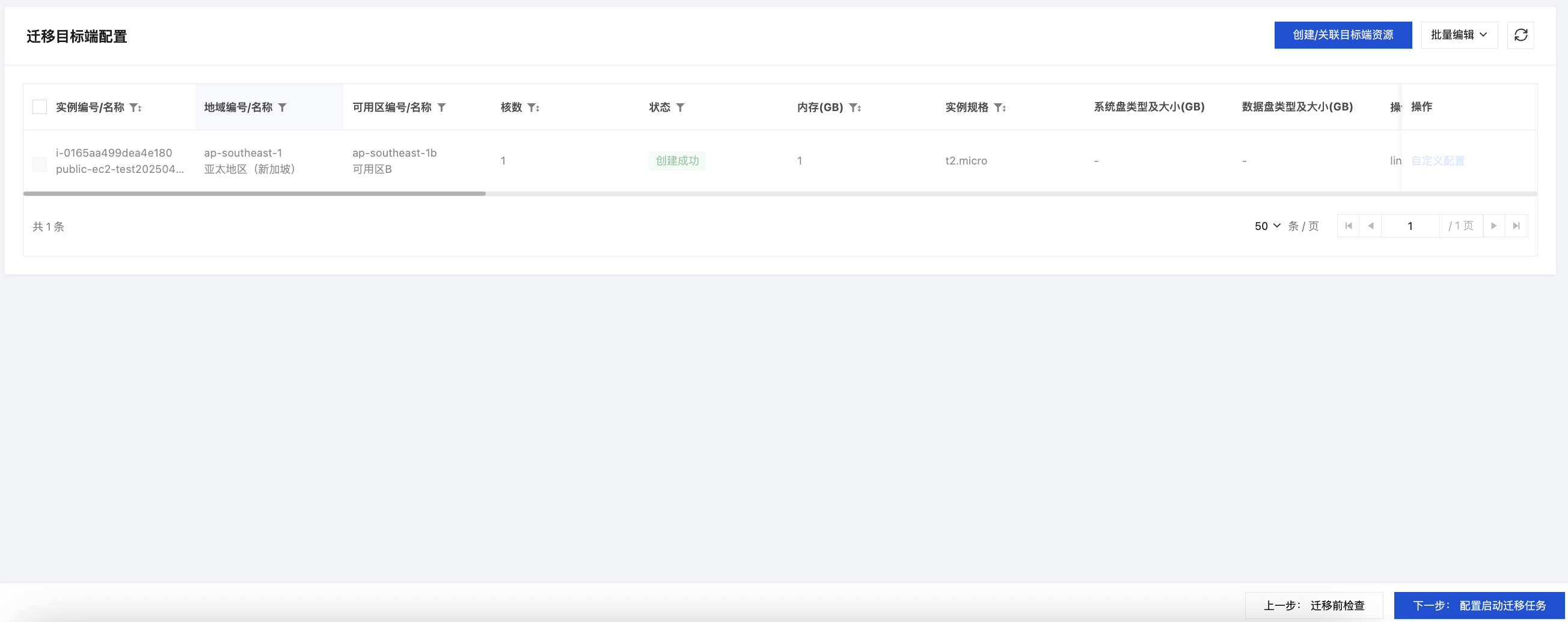 5. 勾选要迁移的资源,单击创建/关联目标端资源,在弹窗中单击确定后,则完成迁移目标端实例或创建,然后单击下一步:配置启动迁移任务。