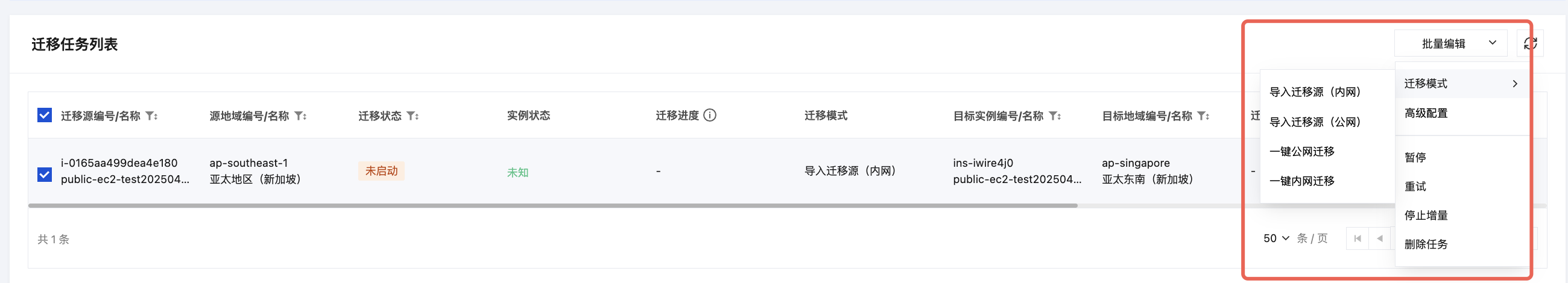 7. 勾选要迁移的服务器,单击启动迁移任务,可以单个或者批量启动服务器迁移任务