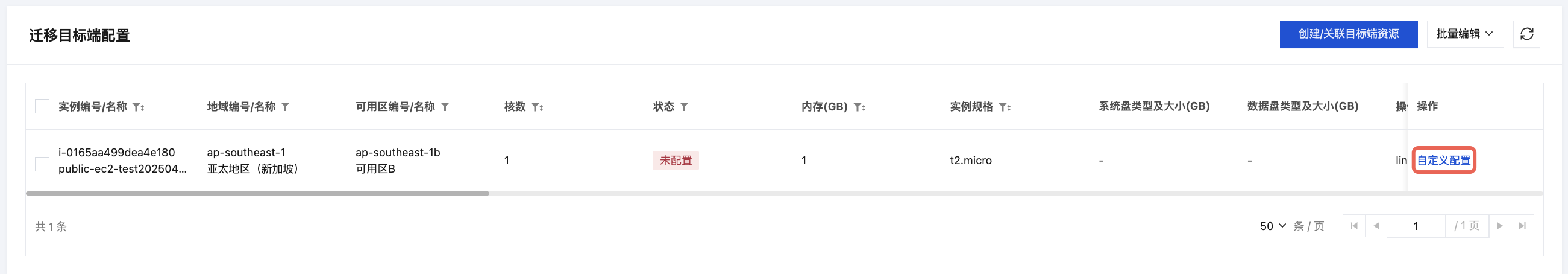4. 在需要迁移的资源操作列中单击自定义配置,在自定义配置中,可以选择按推荐资源创建,或选择迁移至已有资源,然后单击确定。