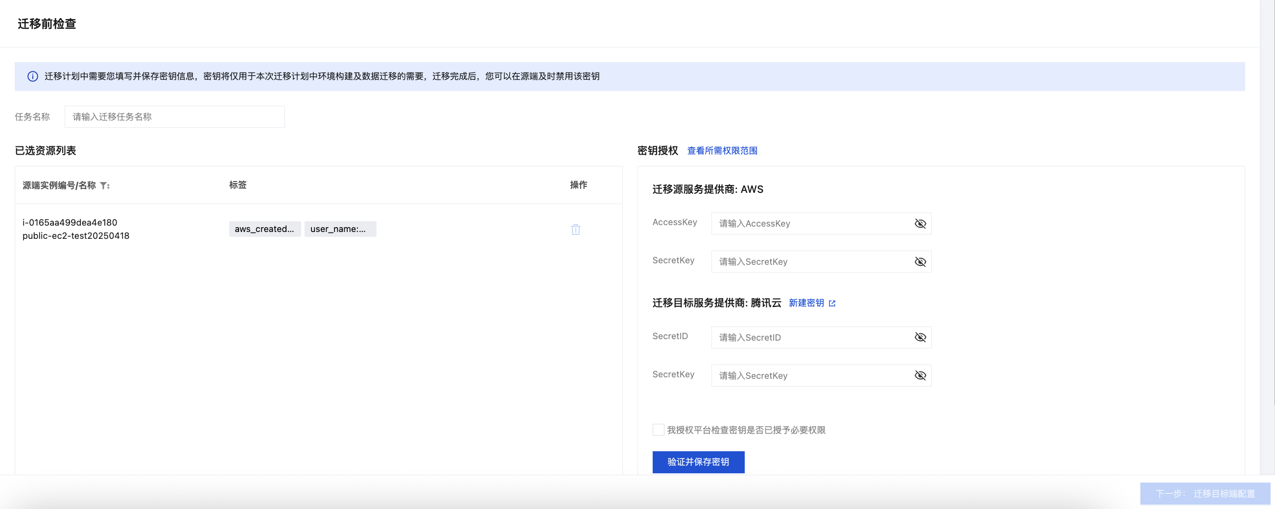 2. 第一步即迁移前检查,输入迁移任务名称,分别填写 AWS 和腾讯云密钥信息后,单击验证并保存密钥。