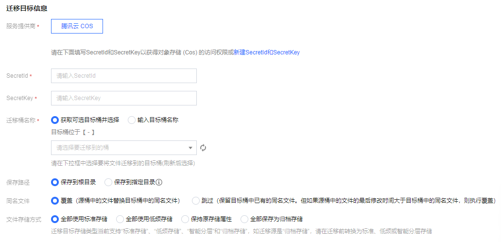 SecretId、SecretKey:输入用于迁移的腾讯云子用户 SecretId、SecretKey。
