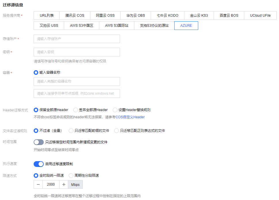 执行速度、限速方式:各公有云厂商的对象存储都有速度限制。为确保业务稳定,请在迁移前与源厂商确认并设置最高迁移可用 Mbps。