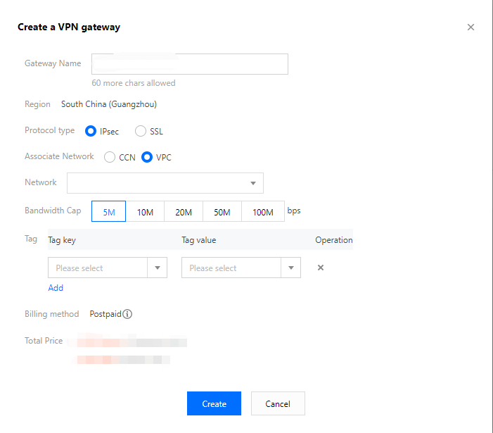 填写 VPN 网关名称(如 TomVPNGw),选择关联网络、所属网络、带宽上限、标签、计费方式,单击