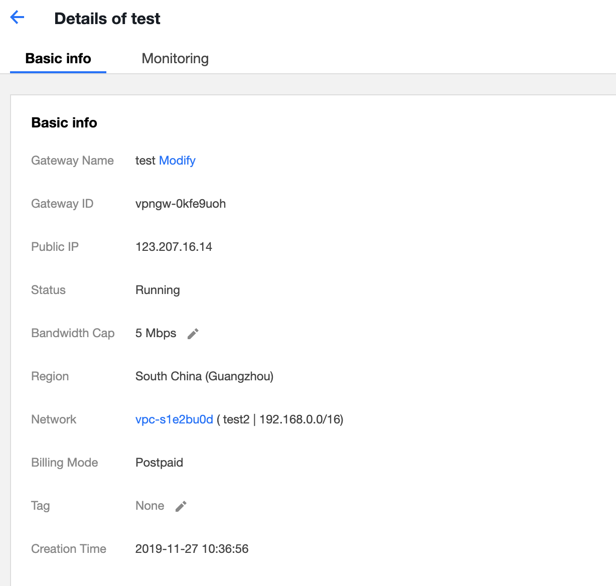 在该页面中,您可以看到 VPN 网关的详细信息。