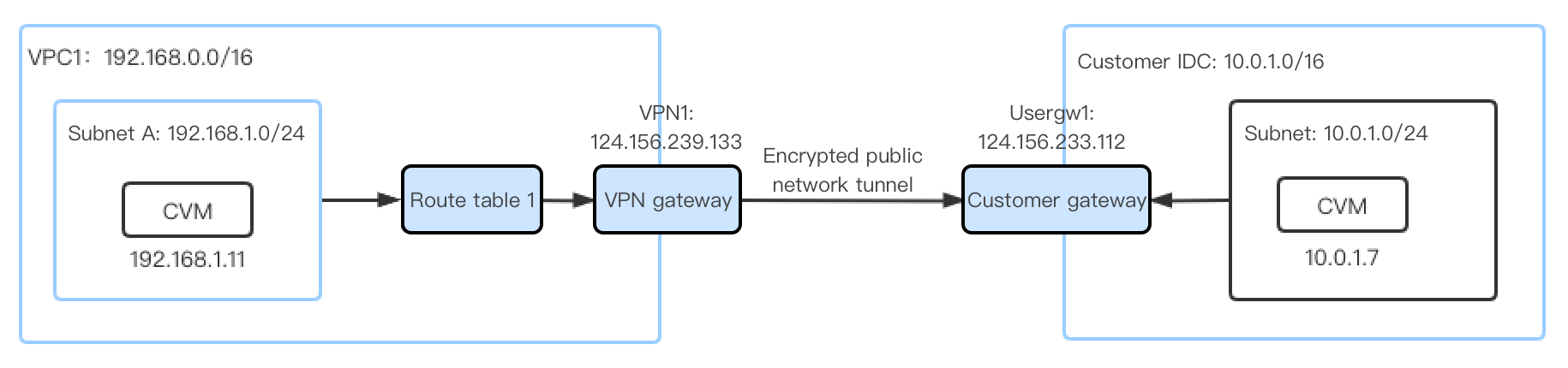 本章节介绍如何快速创建 VPN 连接,并使用路由功能配置路由转发策略,实现 VPC 与对端 IDC 间的安全通信。