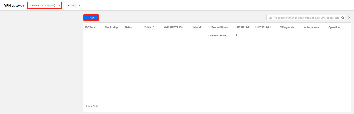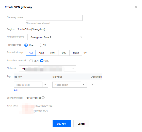 若新建显示灰色,且鼠标移至上方时显示“无可用私有网络”,请 创建私有网络 后再进行新建 VPN 网关。 4. 在弹出的创建对话框中填写 VPN 网关名称(如 VPN1),选择关联网络为私有网络、所属网络选择 VPC1,设置带宽上限及计费方式等。