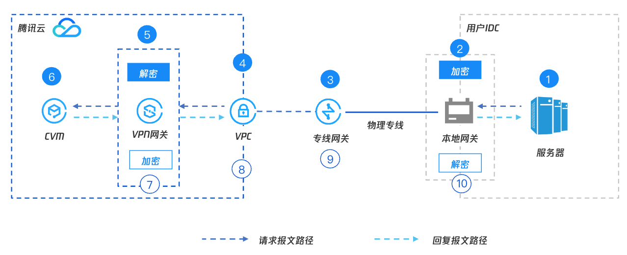 9 | 专线网关 | 专线网关接收到加密后的回复报文后,查询路由表将加密后的回复报文转发至 IDC 本地网关。 |