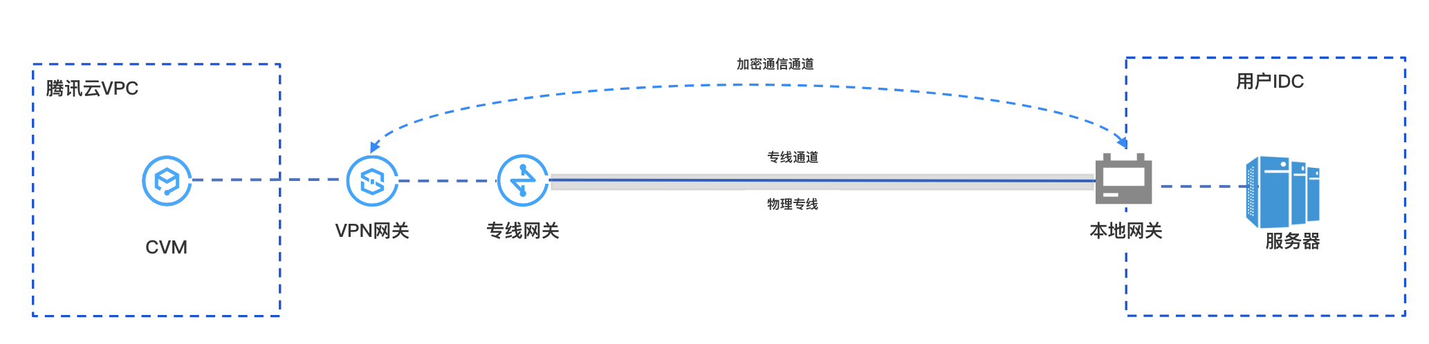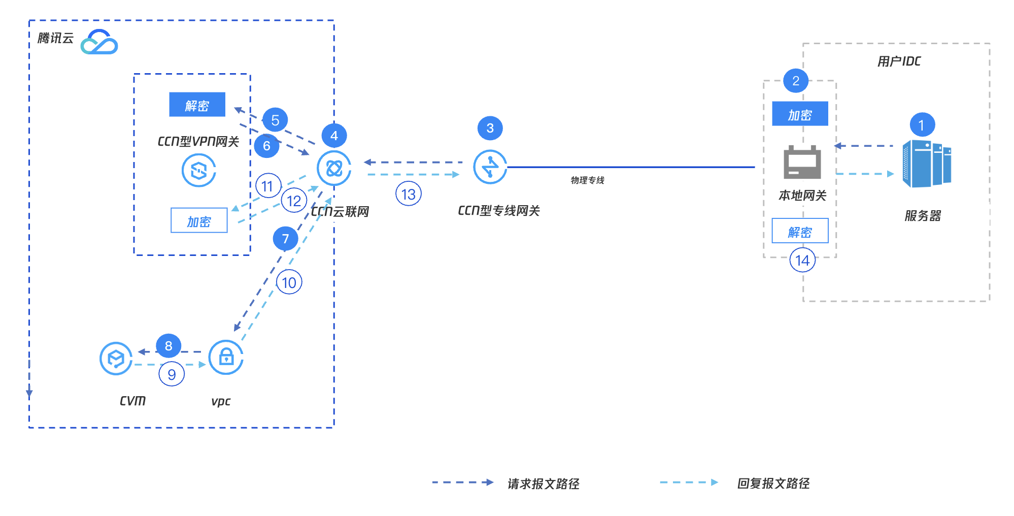 13 | 专线网关 | 云联网将加密后的报文转发到专线网关。 专线网关接收到加密后的回复报文后,查询路由表将加密后的回复报文转发至 IDC 本地网关。 |