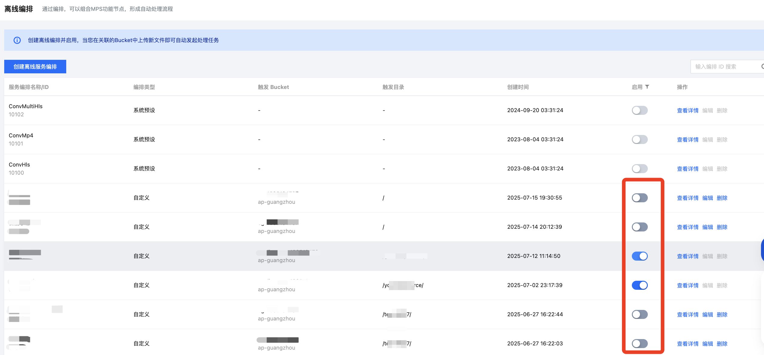 编排启用自动触发后,只对新上传至触发 Bucket 的视频文件生效,之前存放在触发 Bucket 中的文件不会被自动处理。