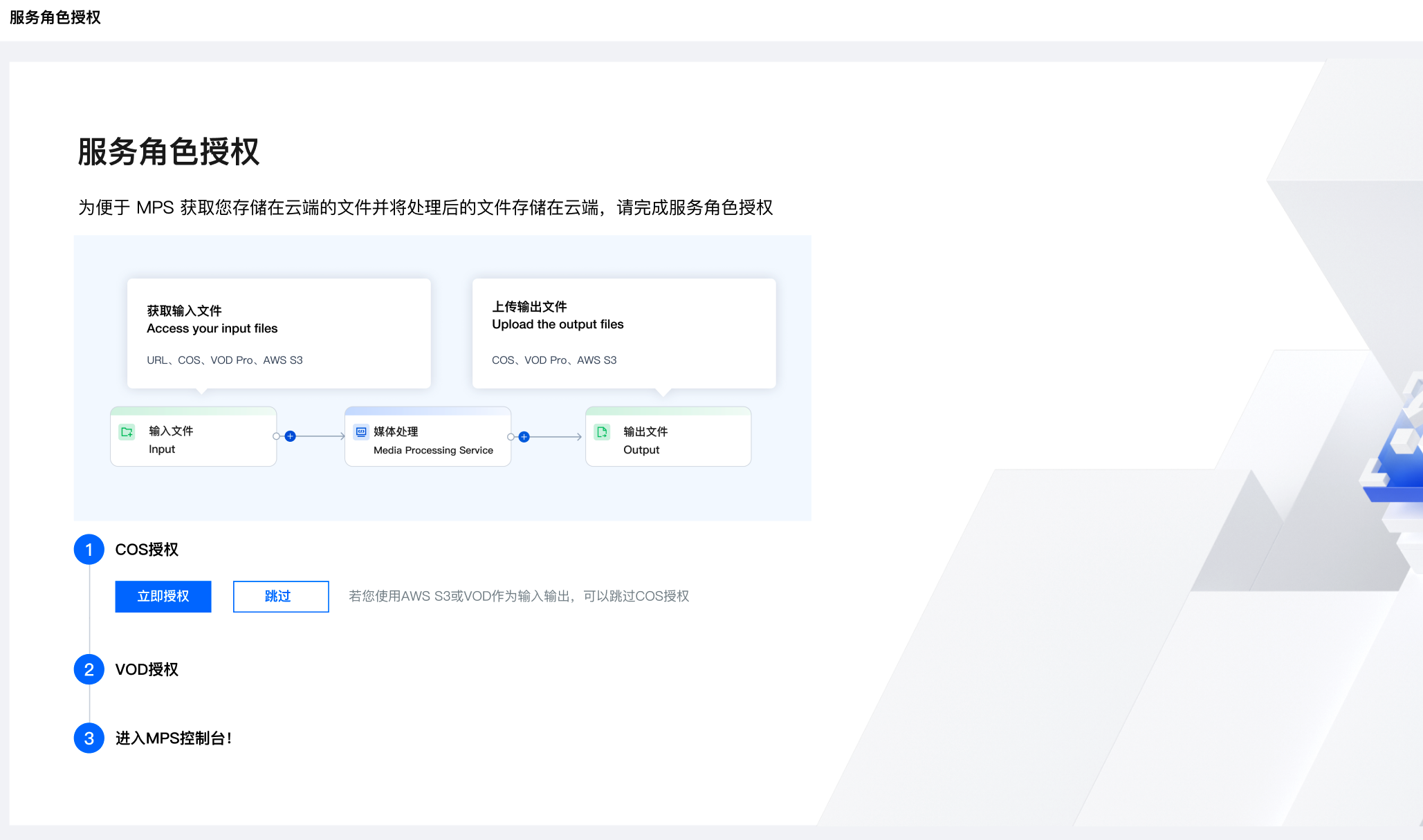 使用 COS:需要完成 COS 服务角色授权,允许 MPS 对您 COS 存储桶中的文件进行下载、转码和上传等读写操作。