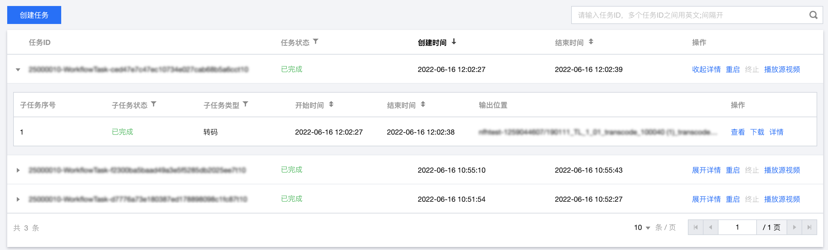 1. 进入 离线任务管理 页面,可以看到您所发起的全部任务的列表。 2. 可以通过任务状态、任务 ID 等筛选需要处理的任务,单击展开详情可以查看子任务信息、同时支持重启排队中的任务、播放源视频等操作。