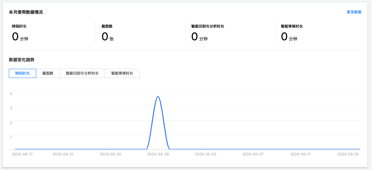 数据变化趋势:展示最近30天的转码时长、截图数、智能识别与分析时长、智能审核时长的变化趋势。