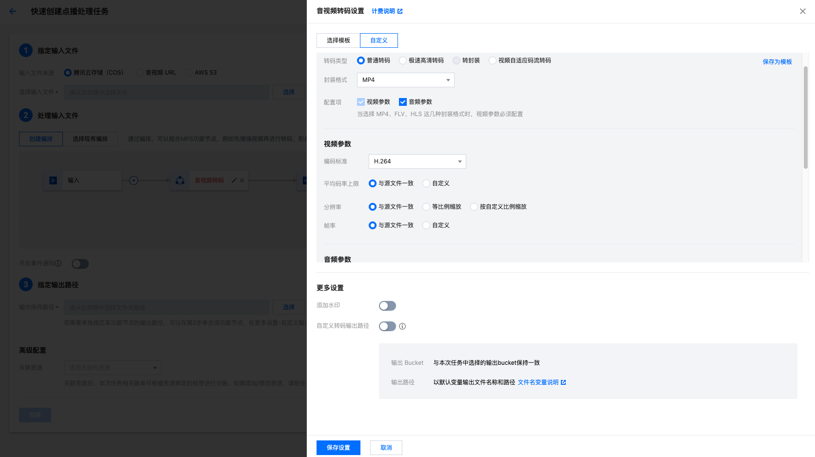以音视频转码节点为例,您可以在 更多设置 > 自定义转码输出路径 中配置。您也可以通过该功能调整输出文件的命名方式,详细可参见 文件名变量 说明。