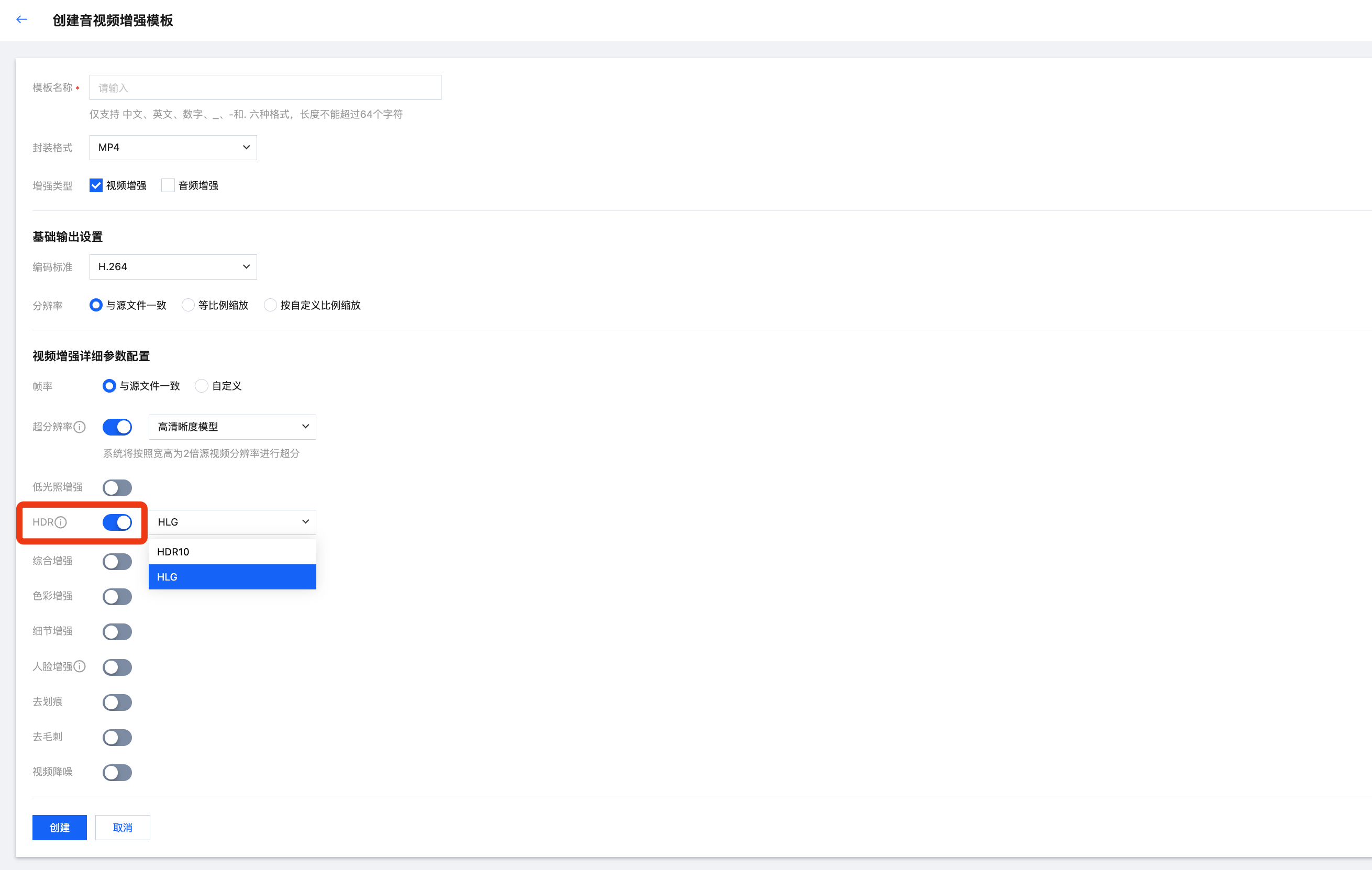 音视频增强功能支持启用 HDR,支持切换 HDR10、HLG 两种模式。注意,使用 HDR 需要将编码标准设置为 H.265,否则处理任务将会失败。