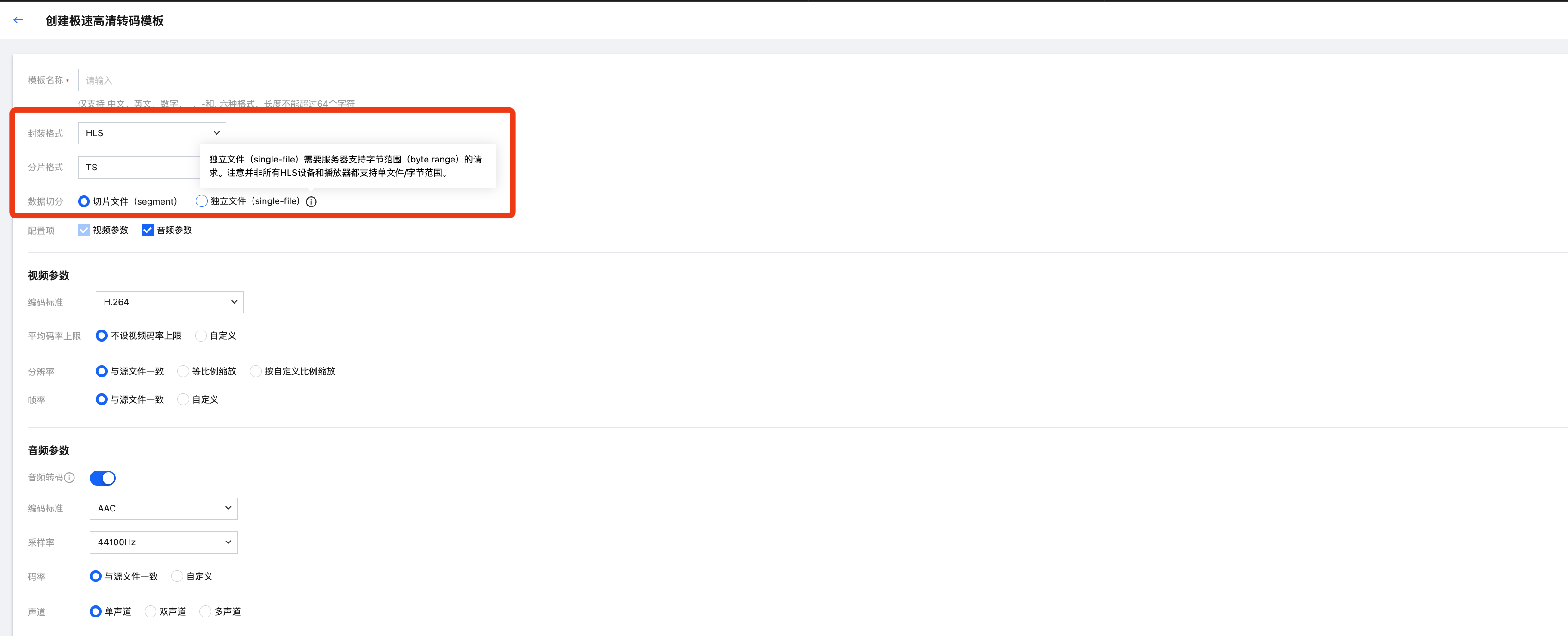当封装格式选择 HLS 时,支持配置分片格式、数据切分模式等。