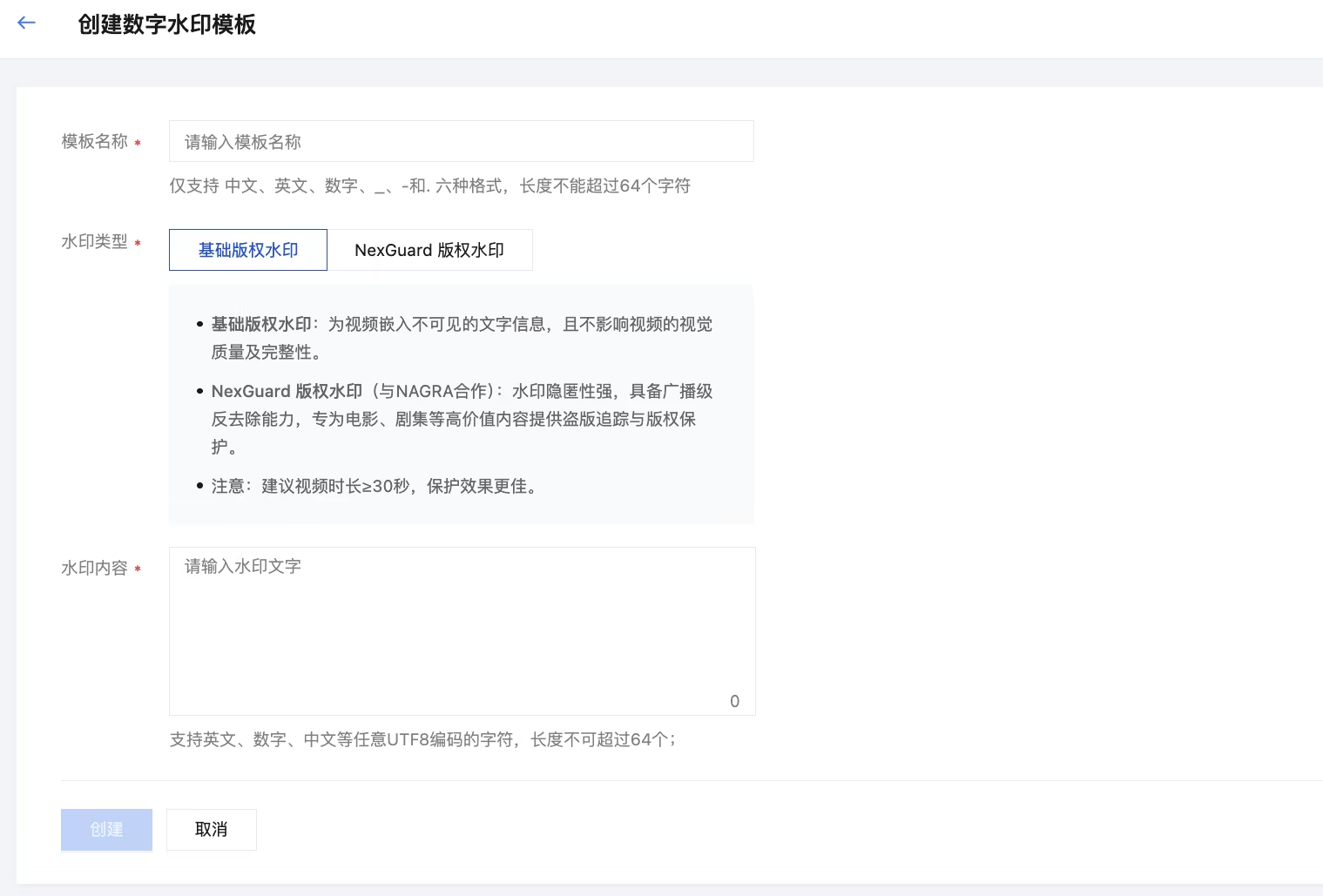 数字水印 | 在不影响视频的视觉质量及完整性的前提下,将肉眼不可见的自定义文字信息嵌入视频中。支持基础数字水印和 NAGRA NexGuard 数字水印两种版本。 |