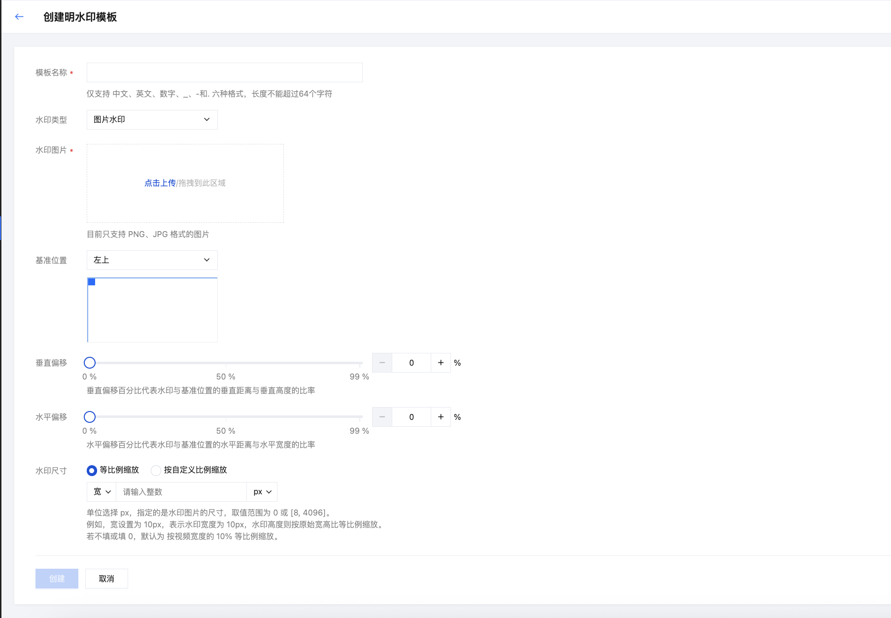 水印类型 | | 支持图片水印、文字水印两种类型。 |