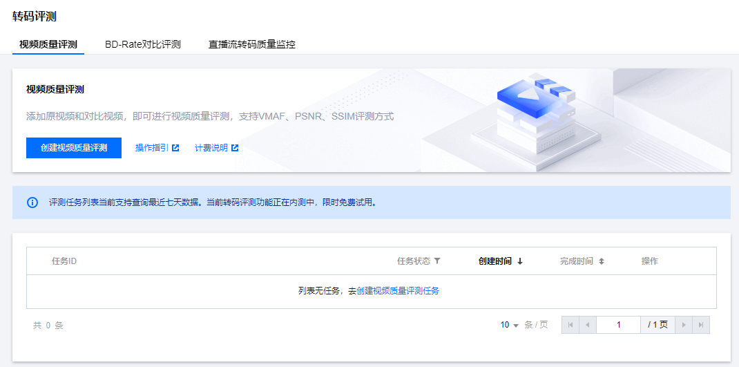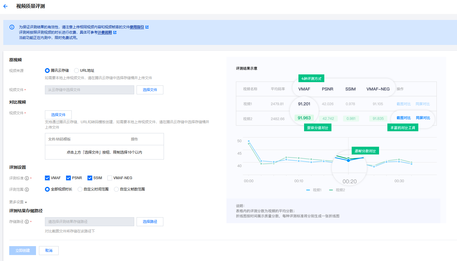 视频评测功能当前支持视频质量评测和 BD-rate 评测。用户可以在控制台视频评测页面,创建评测任务,对比视频转码质量和转码模板效果,支持可视化的数据结果展示。相关功能的收费标准可参考 计费说明。 使用场景