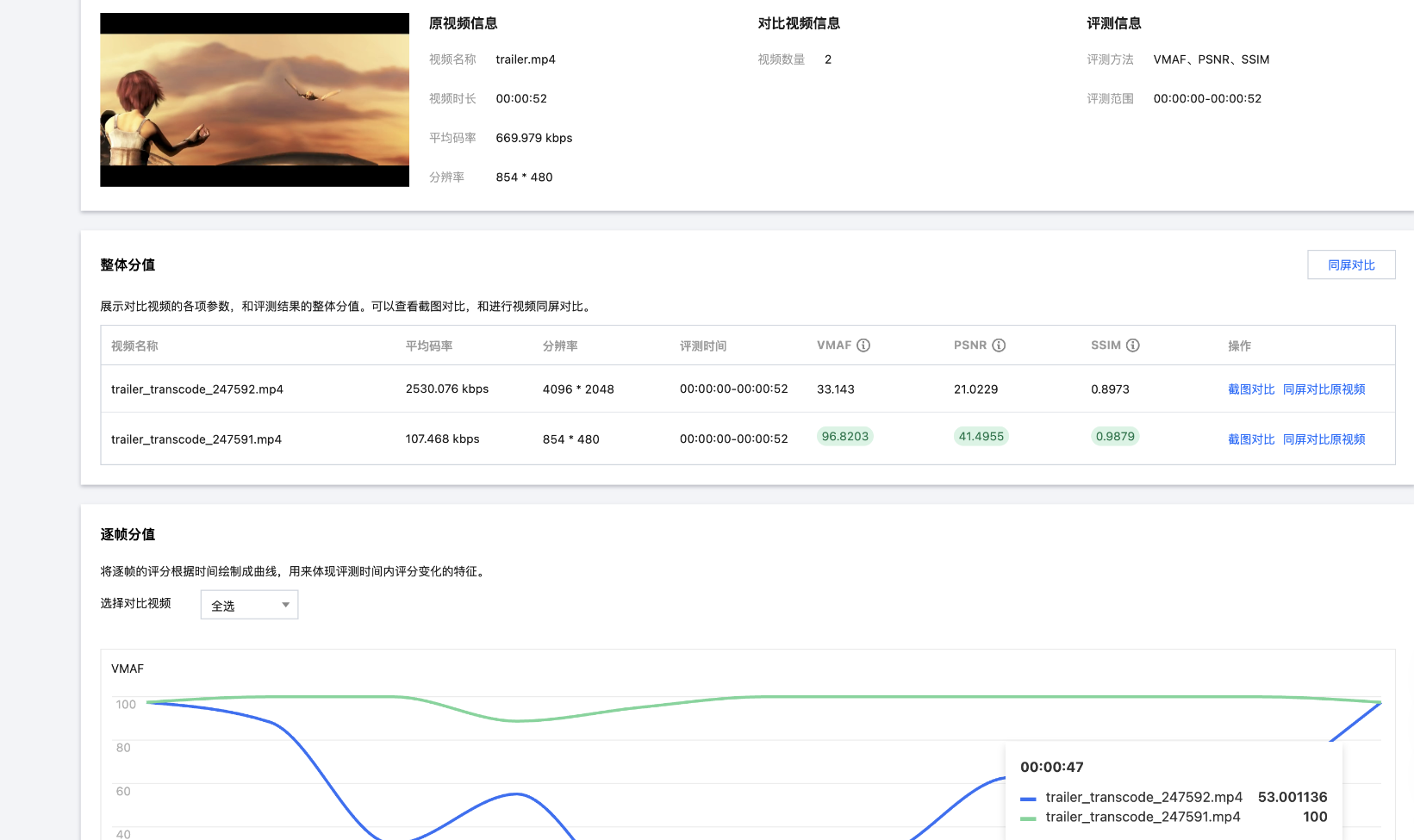 2.1 查看对比视频整体评测分数,支持查看截图和同屏对比视频。