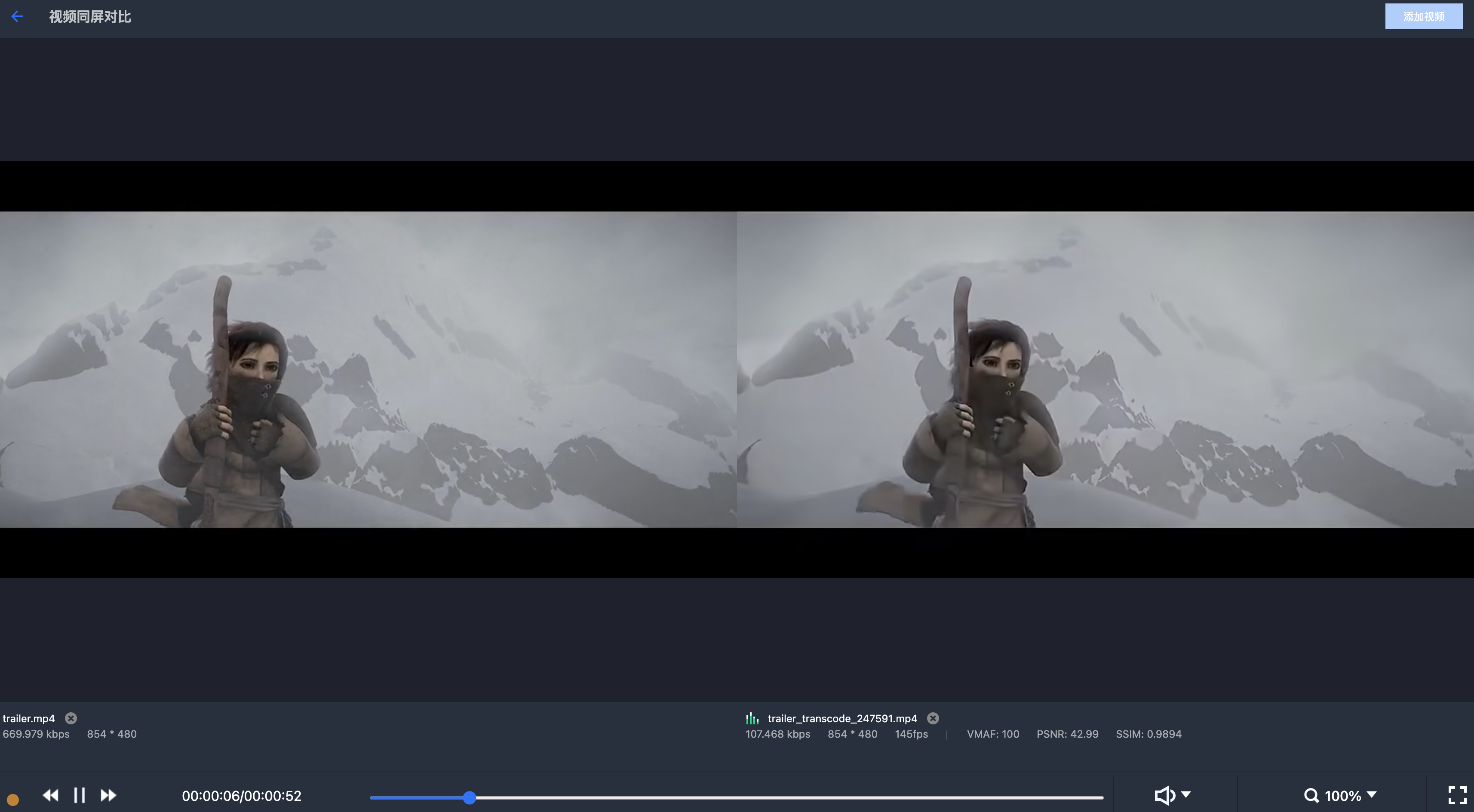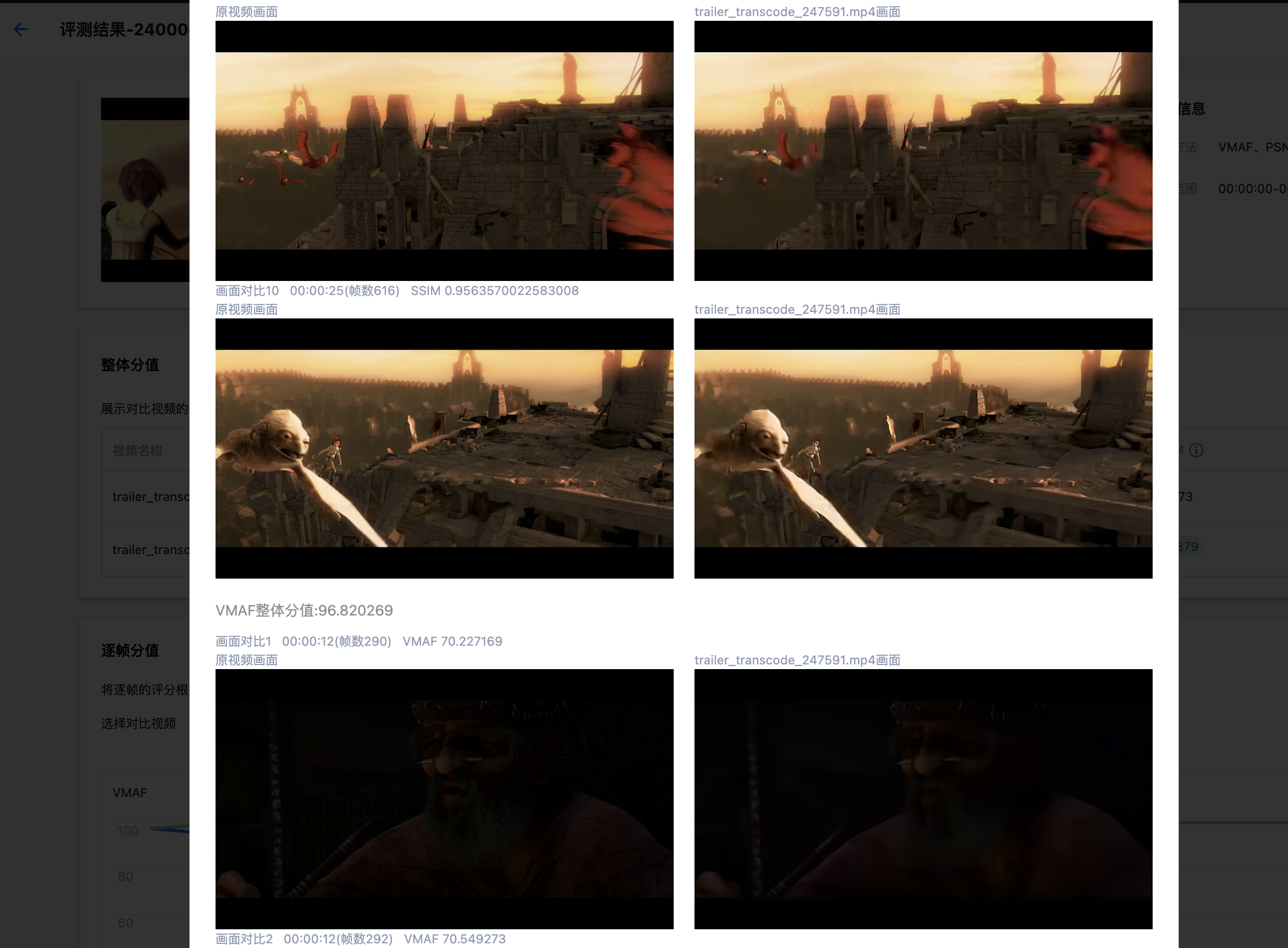 点击查看截图可以展示每个对比视频转码中,画面差异最大帧的图片,并可以显示帧所在的时间,和该帧对应的评测分数。