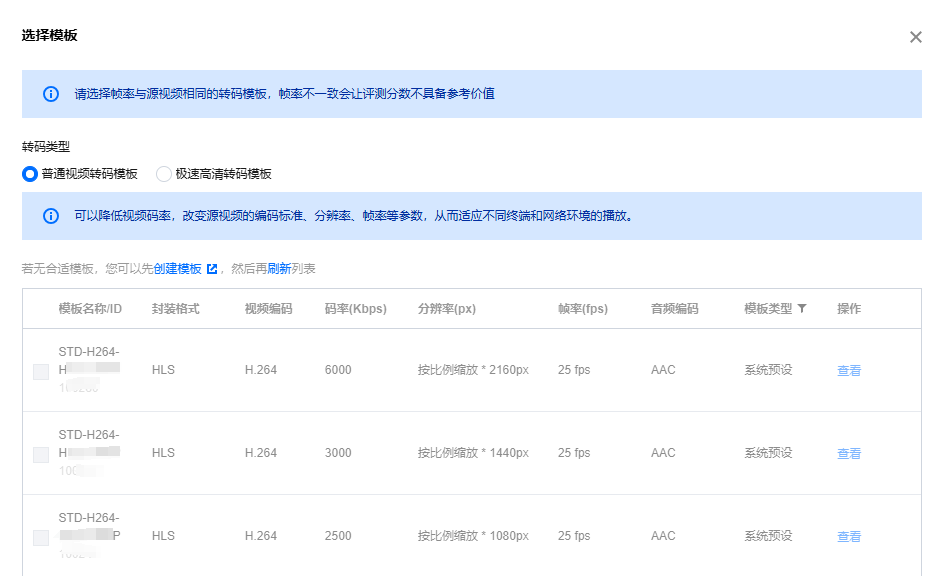 对比视频也支持通过发起转码任务生成,用户可以选择转码模板,通过发起转码任务生成视频。