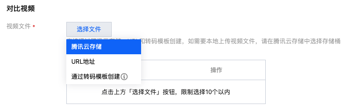 1.2 选择对比视频,每个对比视频都将与原视频进行对比评测,每次评测最多支持选择10个对比视频。对比视频支持选择 COS 存储中的视频文件,通过 URL 获取视频,如需使用本地视频文件,请将文件上传至 COS,再通过 COS 方式选择。