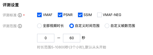 1.3 选择评测方式,可以选择 PSNR、SSIM、VMAF 中至少一种评测方式,在计费时,每一种评测方式将单独计算一次评测帧数。
