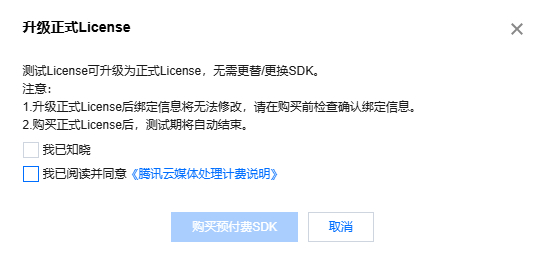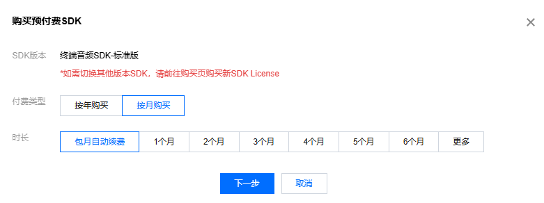 单击购买预付费SDK后,您可以选择按月或按年购买。单击下一步,进入订单确认页面。支付完成后,License 将升级为正式版。