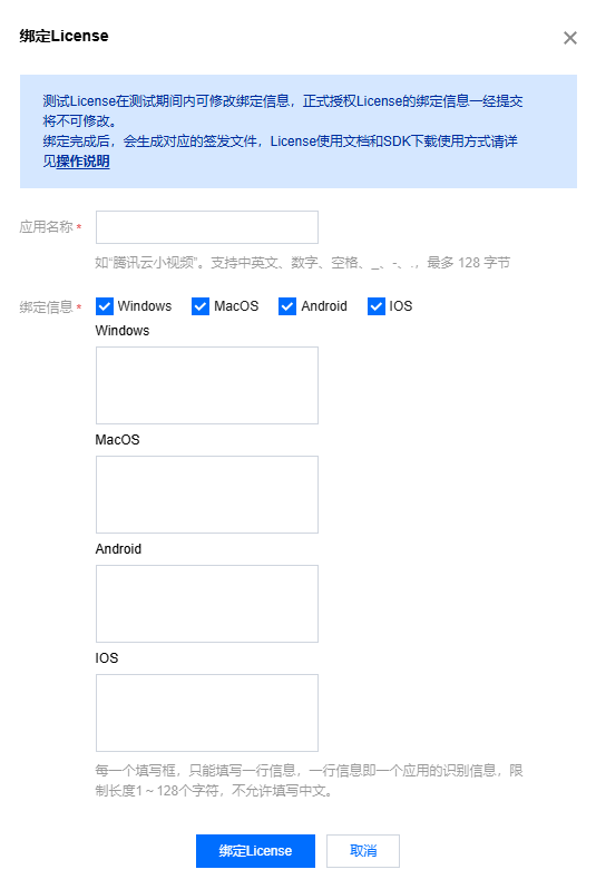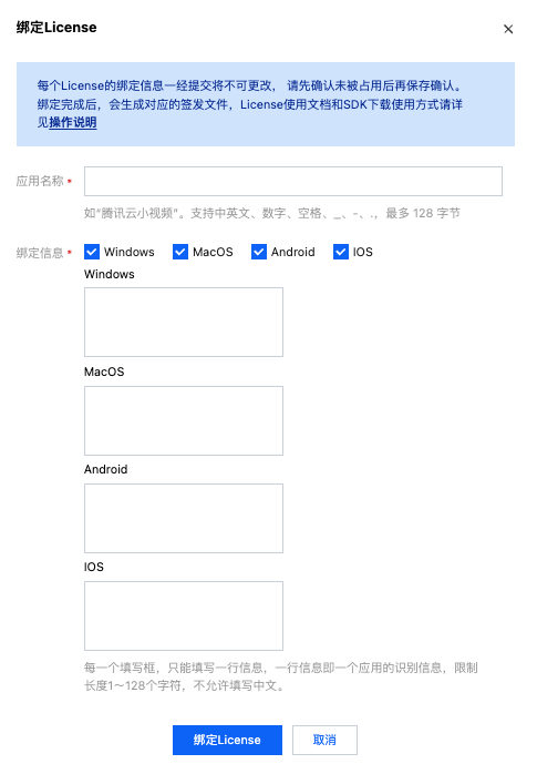 在已购买的 License 上,填写 App 的绑定信息,确认后服务将正式生效。