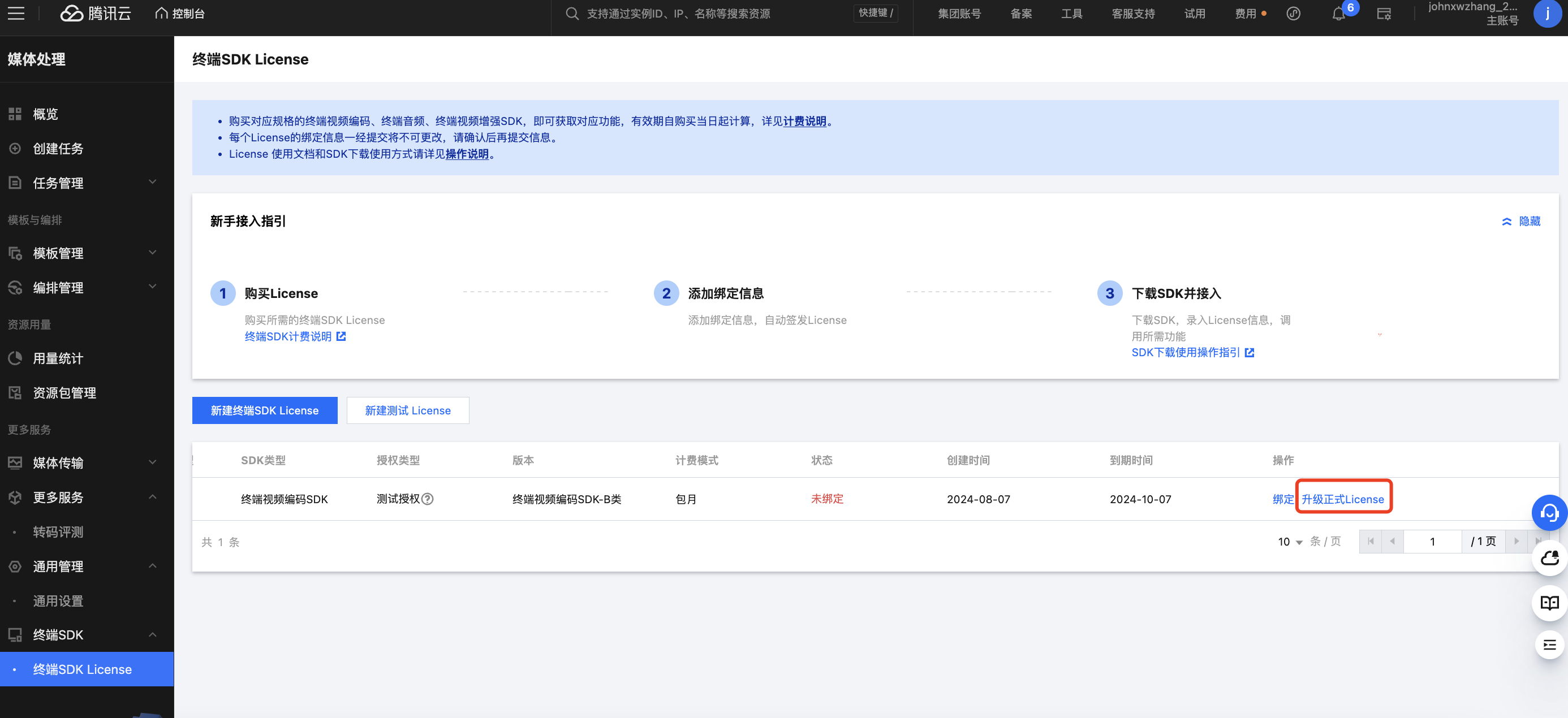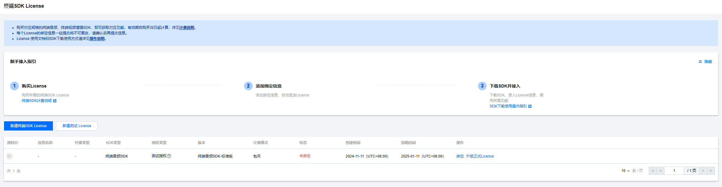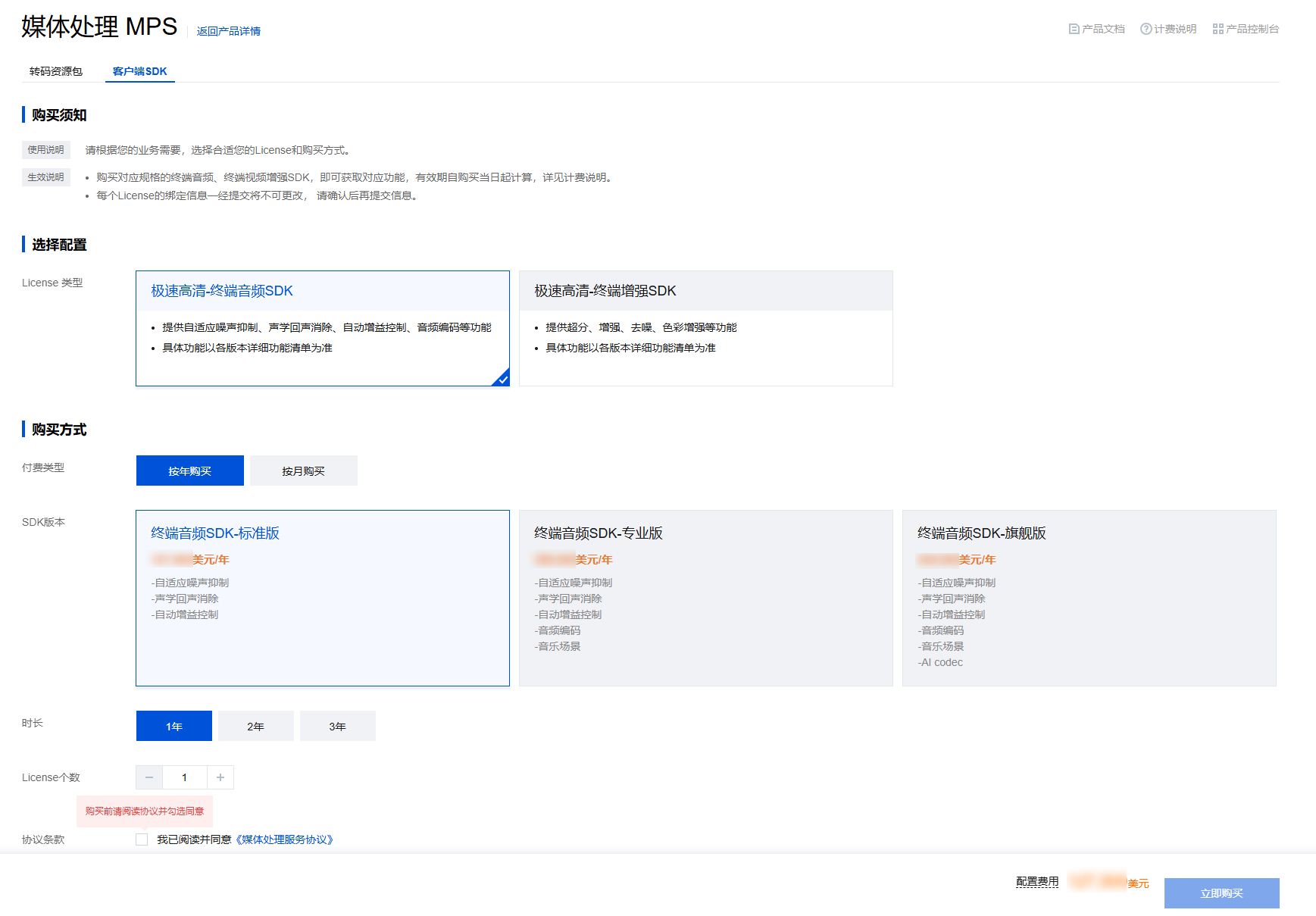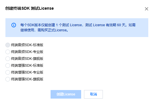 1. License 类型:可选极速高清-终端音频 SDK、极速高清-终端视频增强 SDK。