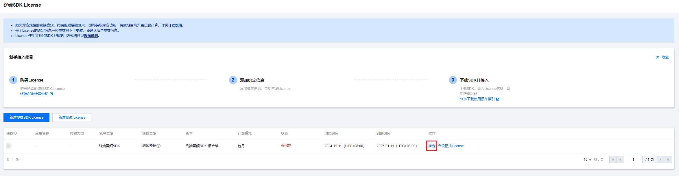申请到的测试 SDK License,默认状态为未生效。需要绑定应用信息后方可生效。
