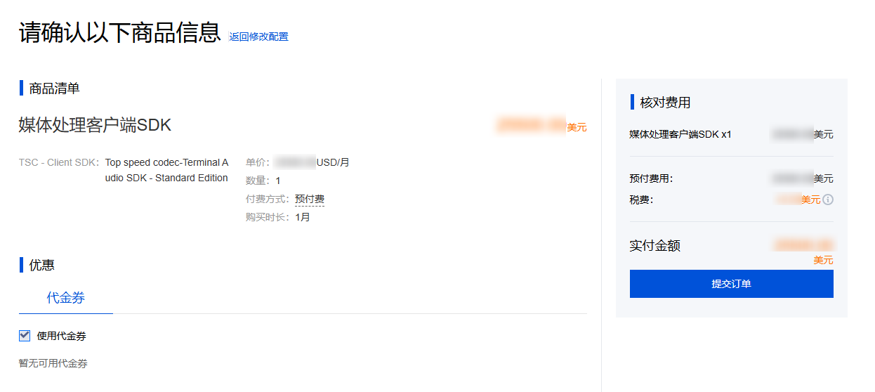 选定所需 SDK 配置信息后,单击立即购买查看本次支付的产品信息。提交订单后选择合适的支付方式完成支付。