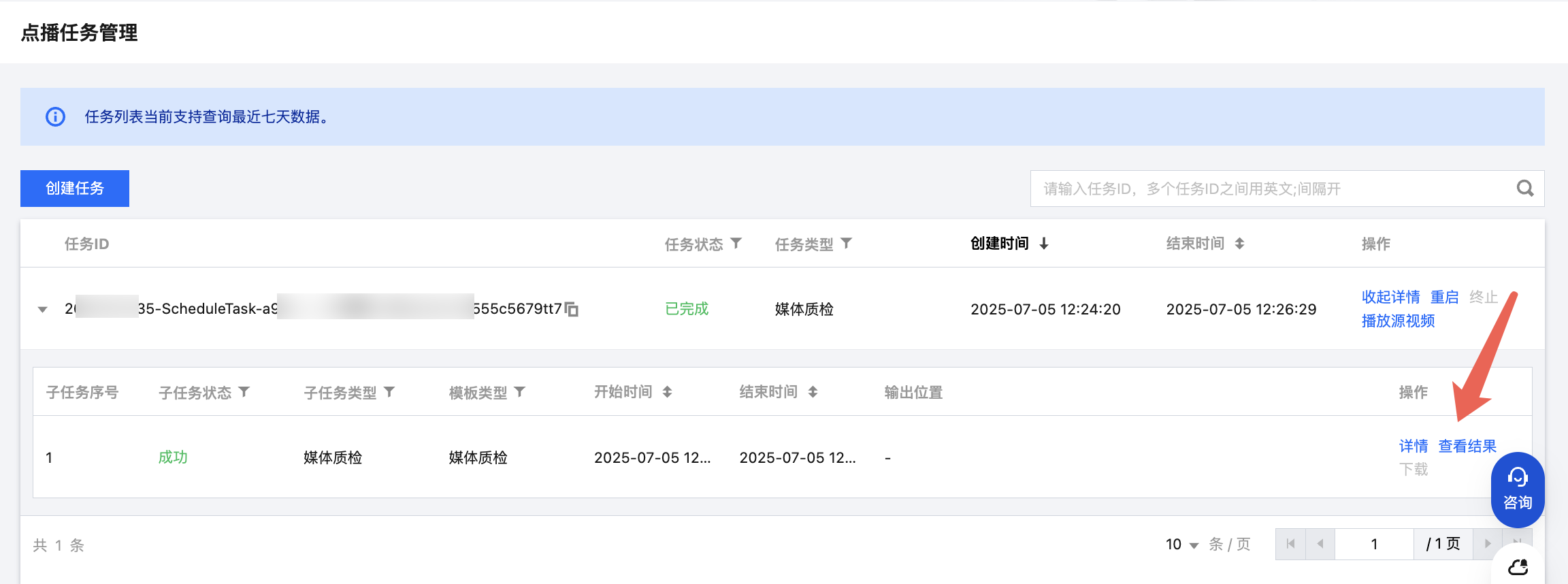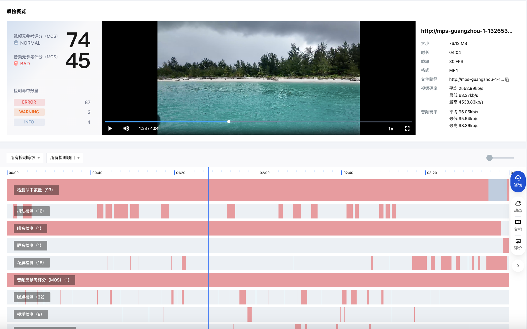 {"Response": {"WorkflowTask": {"Output": {"QualityControlResultSet": [{"Type": "BackWhiteEdge","QualityControlItems": [{"Confidence": 100,"StartTimeOffset": 12,"EndTimeOffset": 12}]}],"ContainerDiagnoseResultSet": [{"Category": "StreamAbnormalCharacteristics","DateTimeSet": [],"SeverityLevel": "Warning","TimestampSet": [11.006],"Type": "AudioDuplicatedFrame"}],"QualityEvaluationScore": 68}}}}