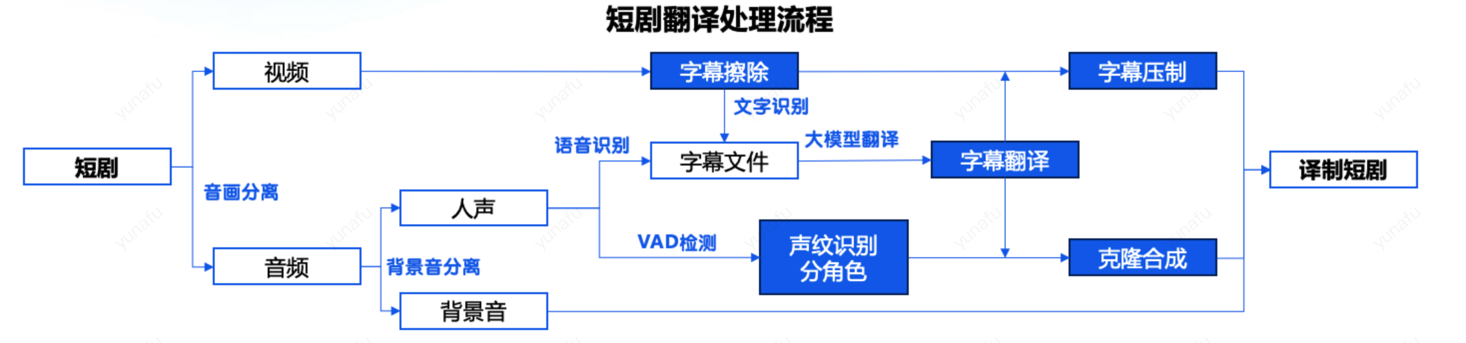 一站式短剧译制(去字幕+语音字幕&翻译+音频合成&替换) | 该功能可一站式完成原始字幕擦除、字幕&语音翻译、多语言字幕&语音替换。使用该场景能力,将对输入视频按以下步骤依次处理: 1. 识别原始视频画面中的字幕,然后进行擦除。 2. 识别原始视频的音频,生成字幕文件,并对其进行翻译,再对翻译后的字幕: 2.1. 渲染到原视频画面字幕位置。 2.2. 通过语音合成,替换原有视频的音轨。 3. 合成新的视频。 效果示例![]() |