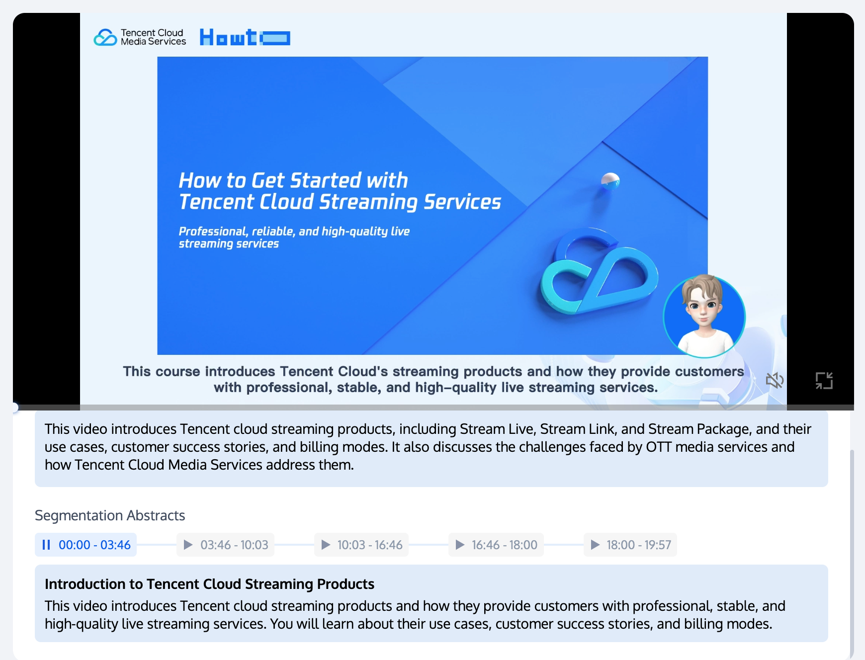 大模型摘要 | 大模型摘要可以在智能识别的基础上,为视频内容生成总结摘要。为视频内容自动化的生成知识点、和课程内容总结。 ![]() | 可通过 体验馆 进行效果体验。 能力接入可参见 大模型视频摘要接入 文档。 |