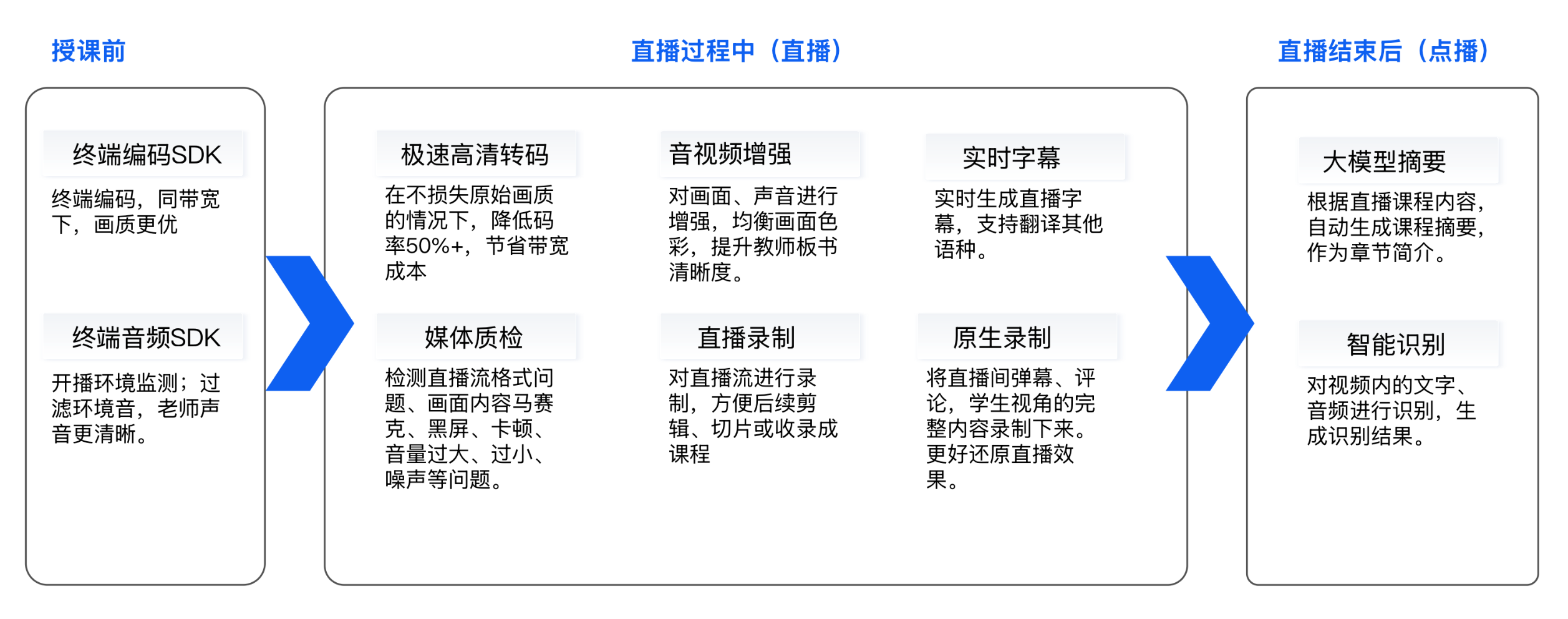 音视频增强 | 业界领先的音视频 AI 增强算法,丰富的业务场景应用模型,全面提升音频和视频质量。支持分布式实时画质增强,包含视频去毛刺、降噪、色彩增强、细节增强、人脸增强、 在教育场景使用,可以优化视频画面色彩、提升板书文字的清晰度。 ![]() | |