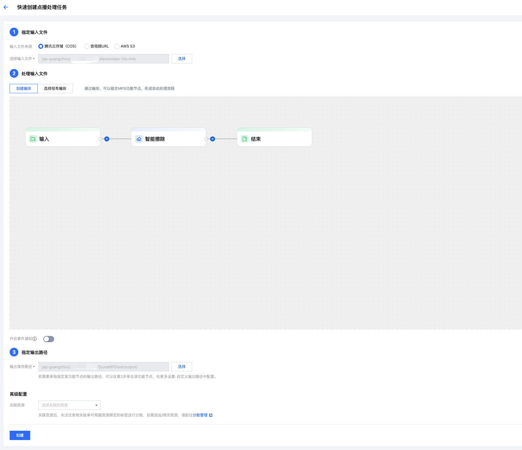 1. 进入控制台 创建任务 页面,单击快速创建点播处理任务。 2. 依次配置输入文件路径、任务处理流程、输出路径。