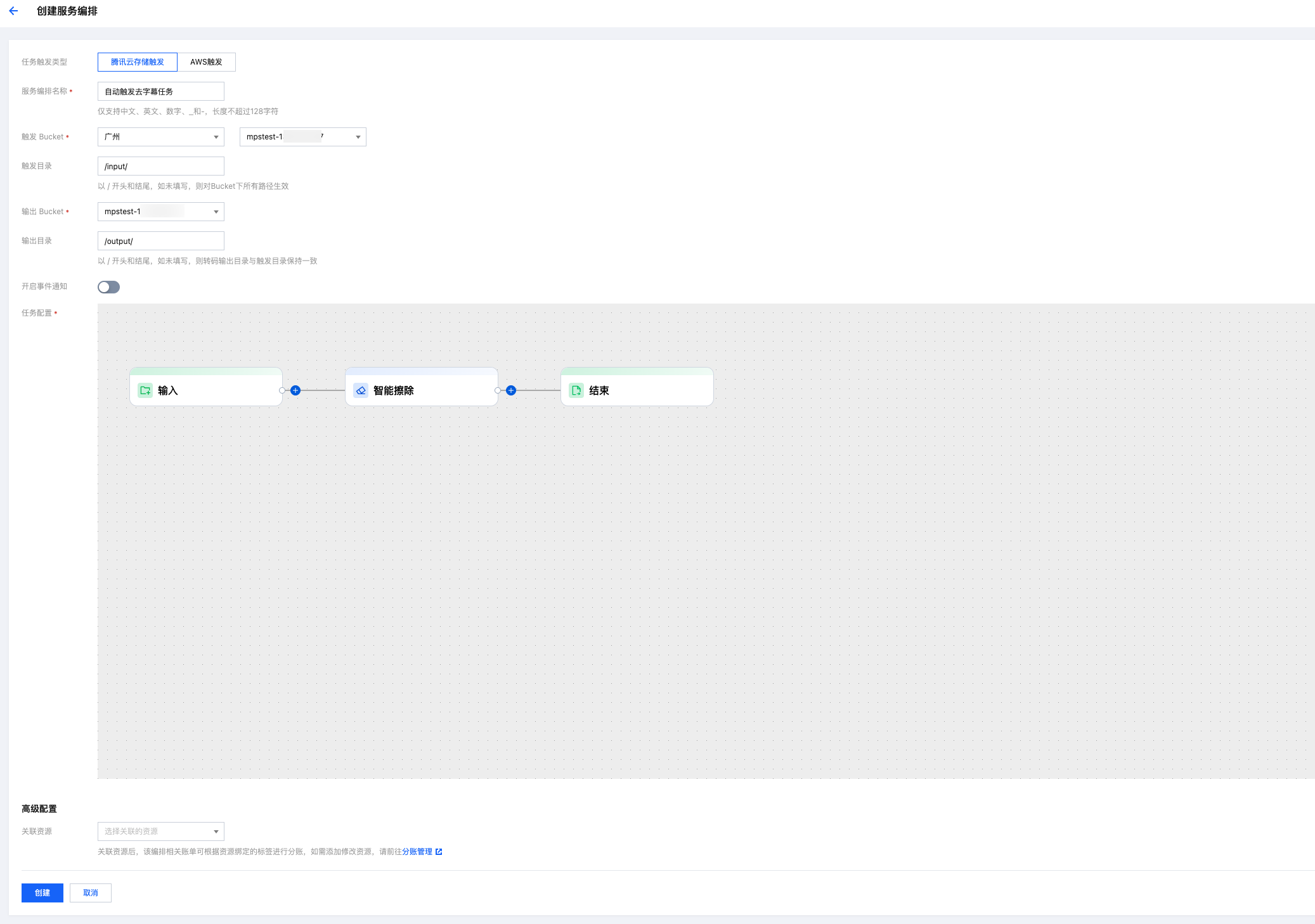 自动触发任务 | 零代码。当指定 COS 路径下上传了新文件,按预设流程和参数自动发起任务,适用于批量自动化操作。 | 进入控制台编排管理页面,创建编排并启用自动触发。 |
