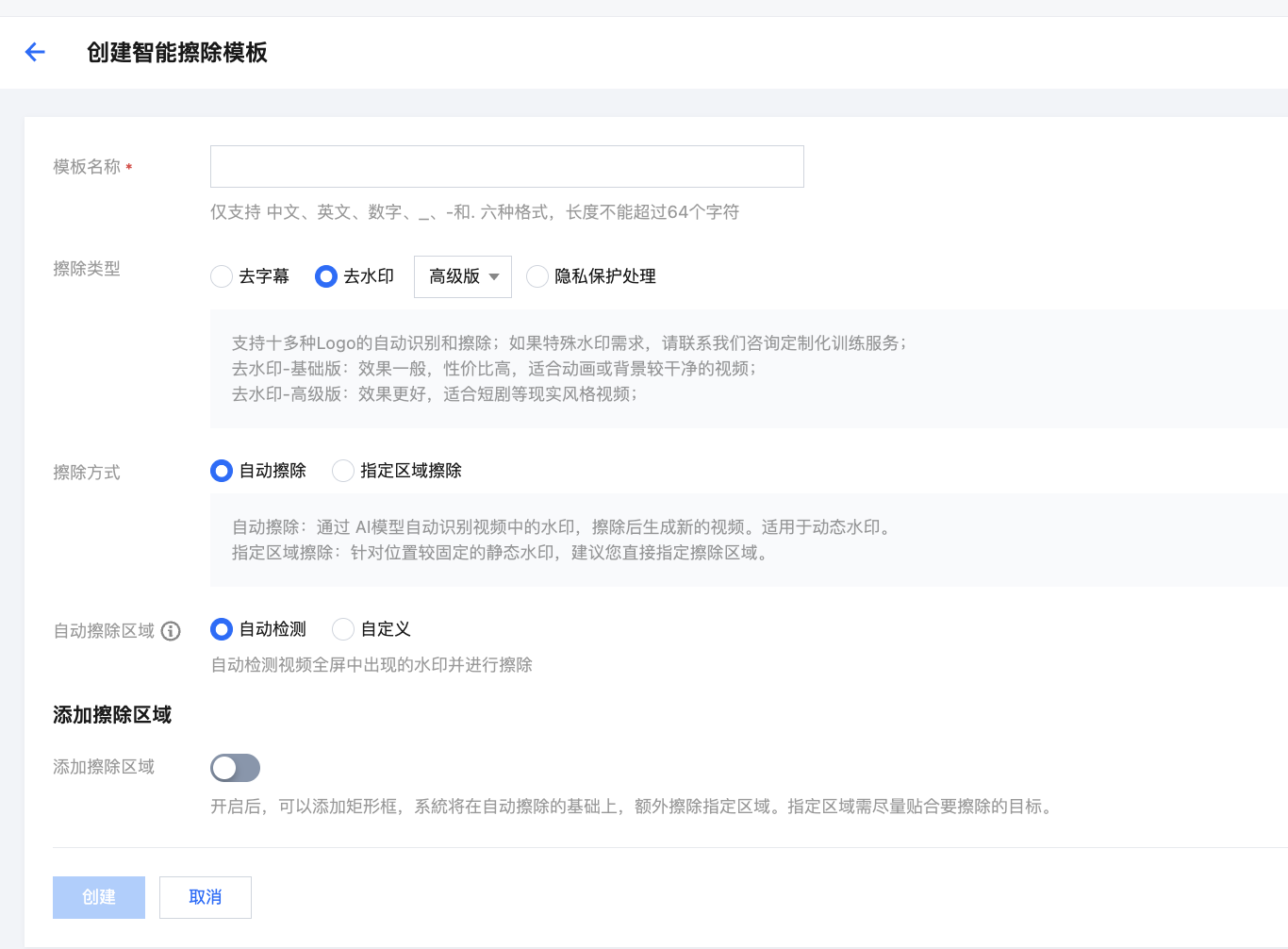 自2025年9月起,控制台和 API 新增“智能擦除”模板。本教程将基于“智能擦除”模板介绍各功能的接入方法。存量使用“智能分析”模板接入擦除能力的客户,请参考 智能擦除接入(旧)文档。 “智能擦除”模板支持更多自定义配置,相比“智能分析”模板使用更灵活。二者仅在功能使用上有所区别,定价一致,无计费调整。