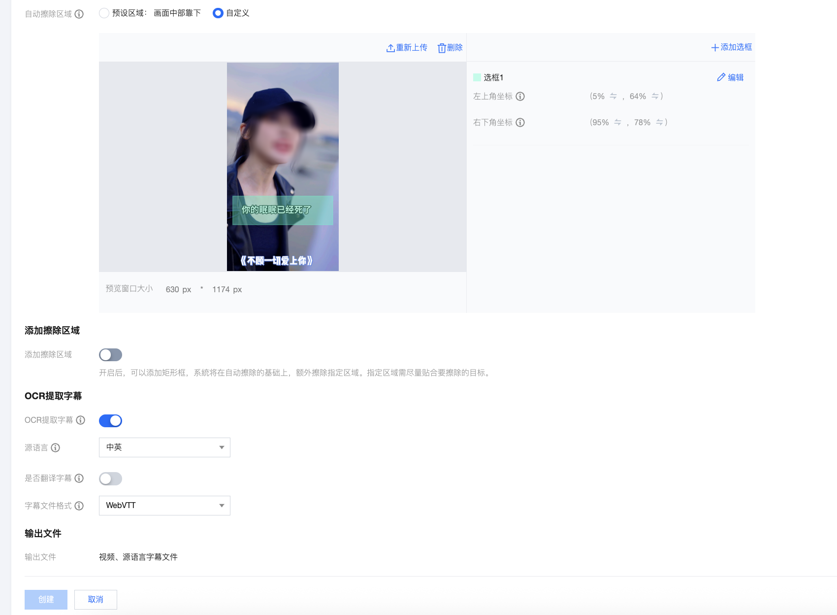 使用去字幕功能,含自动擦除、指定区域擦除、漏擦区域二次处理,不区分“区域版”、“标准版”模型,均收取“去字幕”费用,定价请参考 智能擦除计费说明。 模板配置场景1:自动擦除(默认参数)